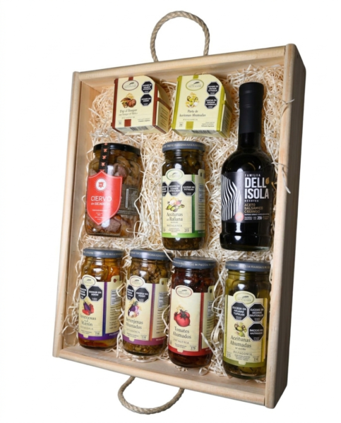 Un banquete patagónico en una sola bandeja. Este set combina la exclusividad del Ciervo en Escabeche con una selección completa de vegetales ahumados y aderezos mendocinos, creando el escenario perfecto para una degustación de alta gama en casa.