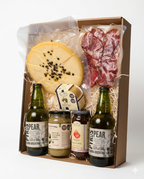 Descubrí la frescura de la pera patagónica en una combinación gourmet pensada para el atardecer. Este box propone un maridaje innovador donde la dulzura sutil y la burbuja de la sidra Pyrus realzan los sabores intensos del queso a la pimienta y los embutidos seleccionados.