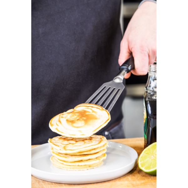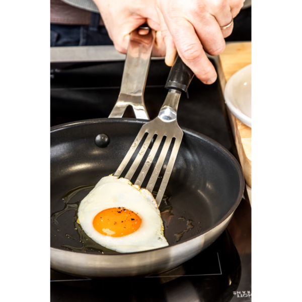 cabezal largo de acero inoxidable para sacar alimentos delicados, como pescado, de las sartenes.