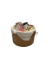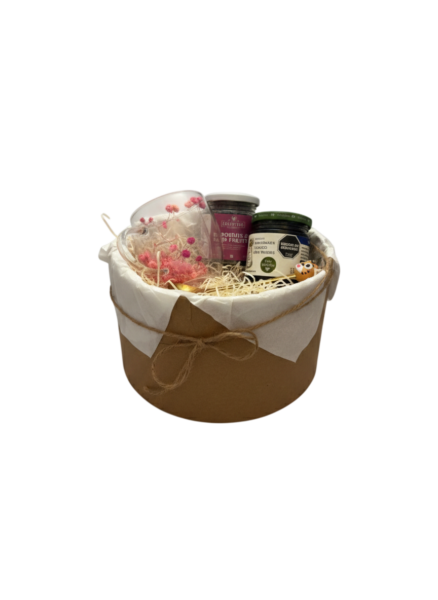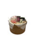 Terminación: Base de viruta de madera blanca y papel seda, cerrada con un lazo de soga que completa la estética rústica-femenina.