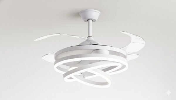 Sus aspas transparentes de acrílico se despliegan únicamente cuando está en funcionamiento, alcanzando un diámetro de 107 cm; al apagarse, se repliegan y reducen el diámetro a 50 cm, dejando solo el cuerpo minimalista de los aros, logrando un acabado limpio, elegante y al ras del techo.